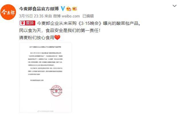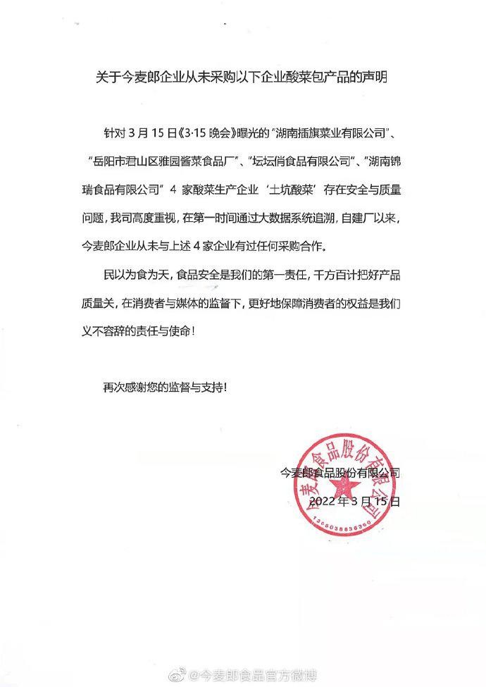 3月15日,今麦郎曾发声明:民以食为天,食品安全是我们的第一责任,请麦粉们放心食用。