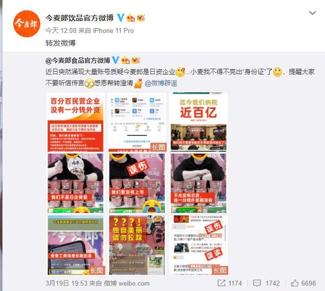 3月20日,“今麦郎再发声”登上微博热搜。3月19日晚间,今麦郎再次发微博表示,遭受诸多不明真相的误伤、误读、误解,重申自身中国民营企业身份:百分百民营企业,没有一分钱外资。