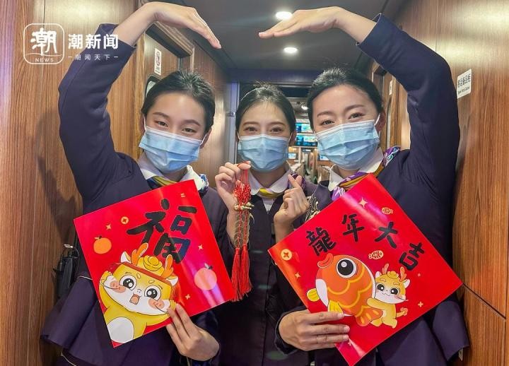 杭州客运段高铁五车队乘务员在G3246次列车上给旅客送福迎新。