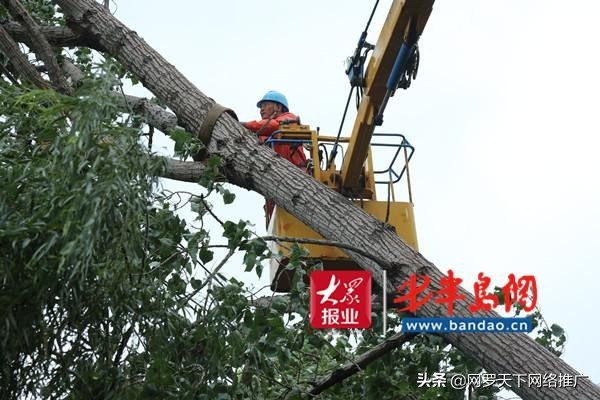 在胶东街道10千伏和于线抢修现场,两棵30年树龄的大树倒在线路上,抢修队员动用了吊车、路灯车等大型机械车辆,才将倒了的大树清理出去,用了接近三个小时,恢复了该线路的供电。下午两点,抢修队员们才开始吃今天的第一顿饭。
