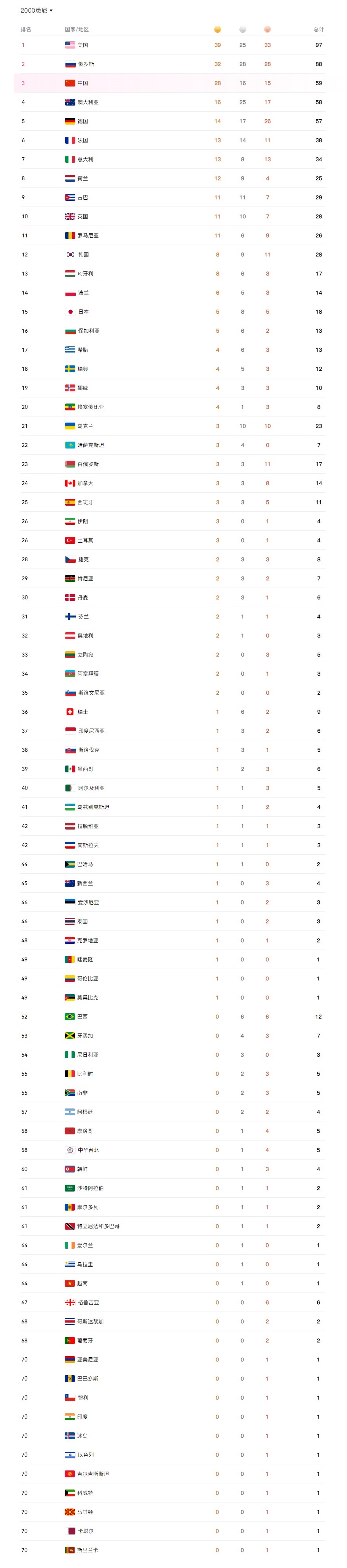2000悉尼奥运会奖牌榜