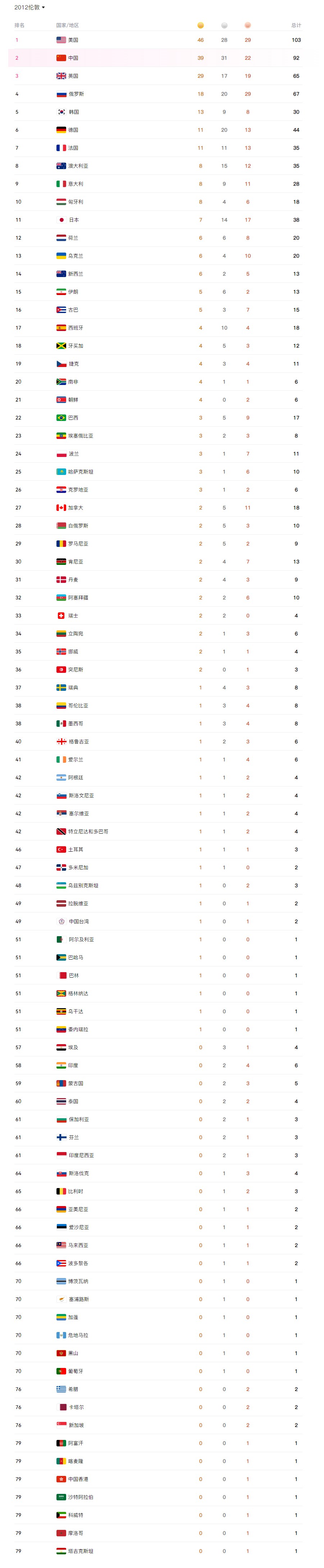 2012伦敦奥运会奖牌榜