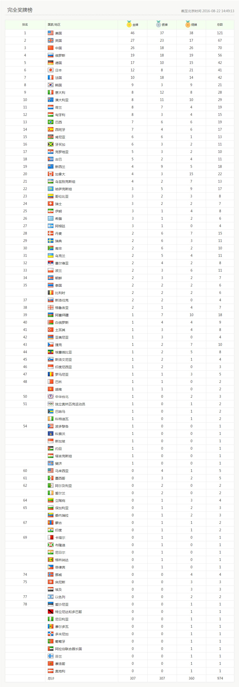 2016里约奥运会奖牌榜
