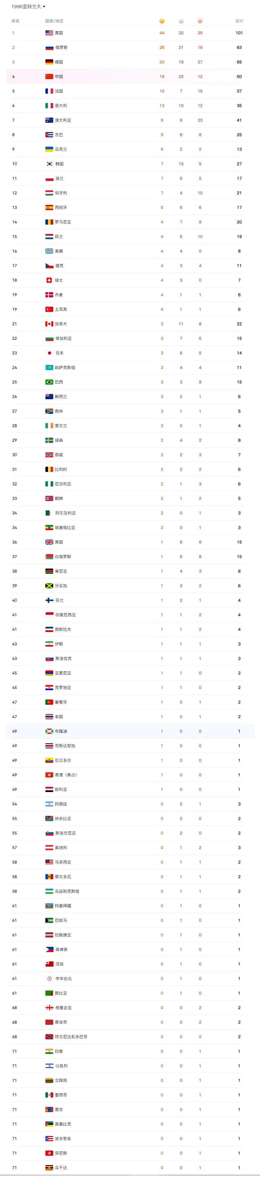 1996亚特兰大奥运会奖牌榜