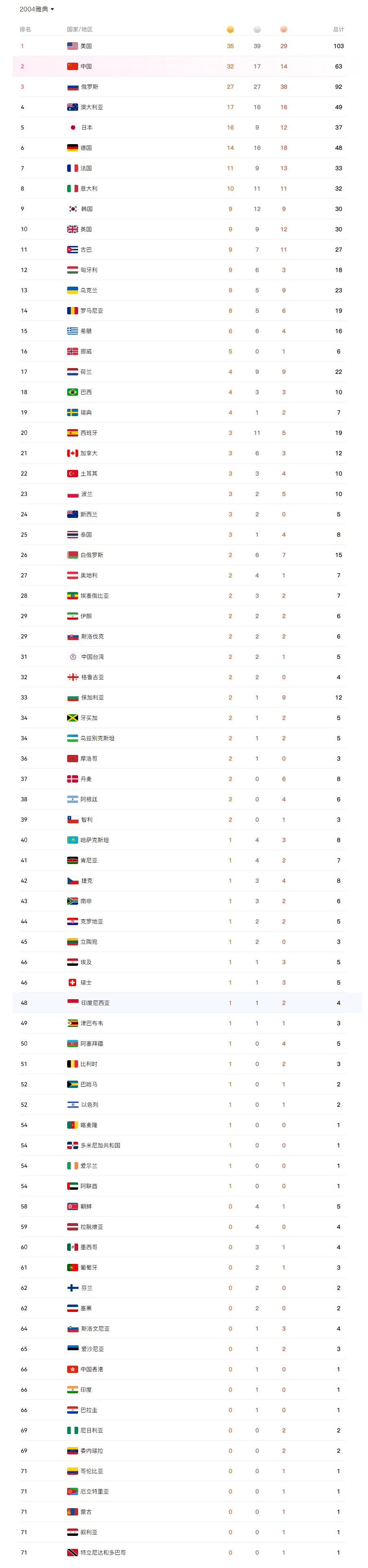 2004雅典奥运会奖牌榜