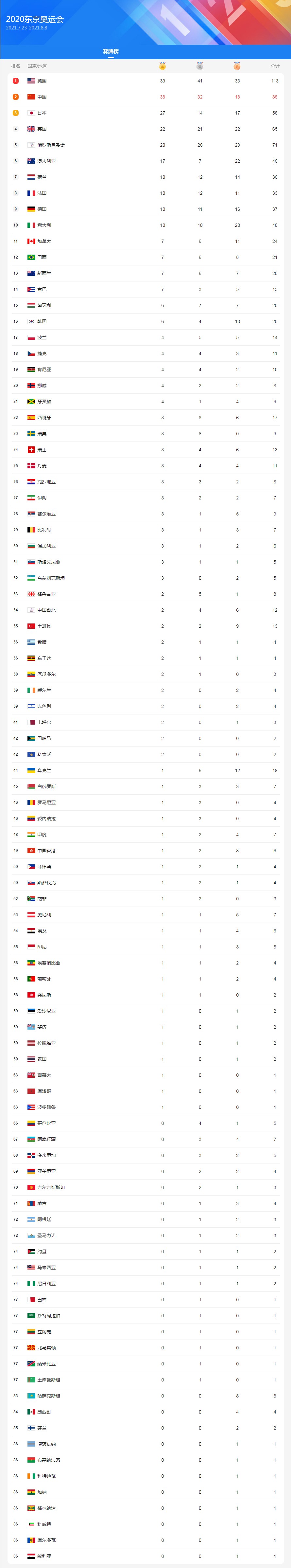 2020东京奥运会奖牌榜
