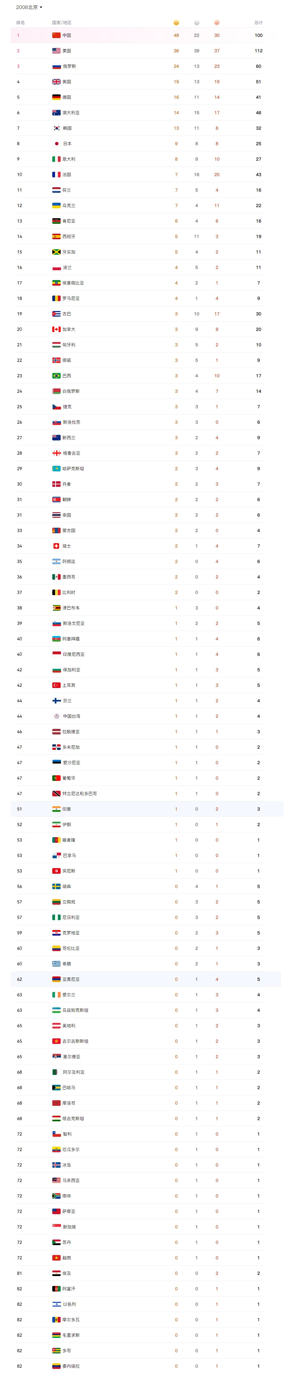 2008北京奥运会奖牌榜
