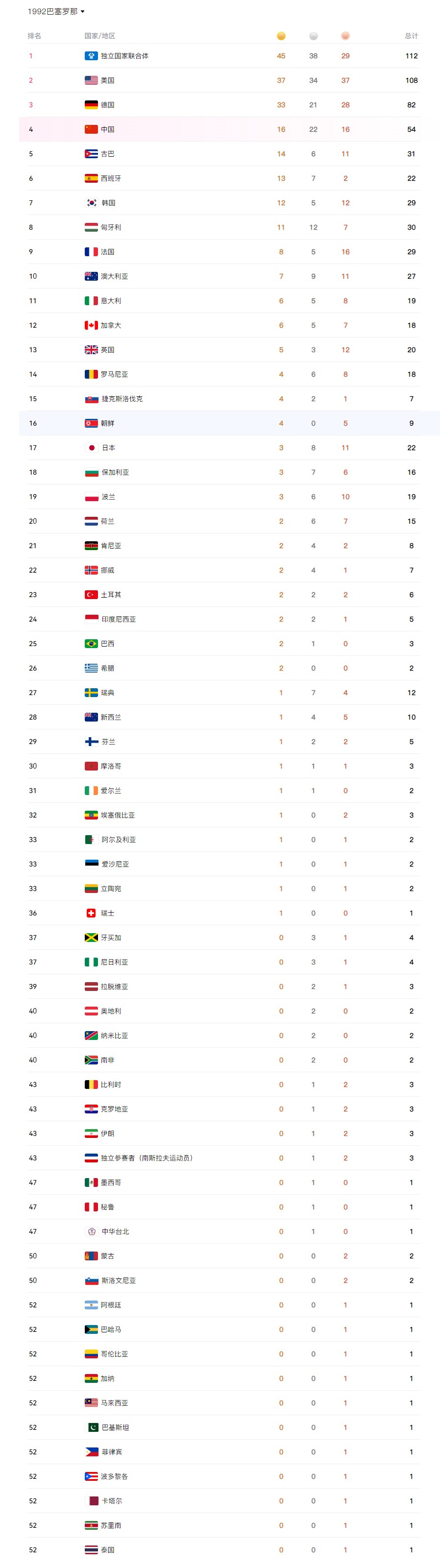 1992巴塞罗那奥运会奖牌榜