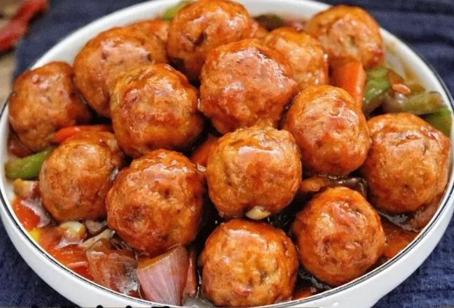 (4)中火煮10分钟后加入蒜末,最后淋入水淀粉翻炒至丸子粘稠即可出锅,肉嫩多汁特别好吃一口一个停不下来老人孩子都喜欢吃,过年必备!