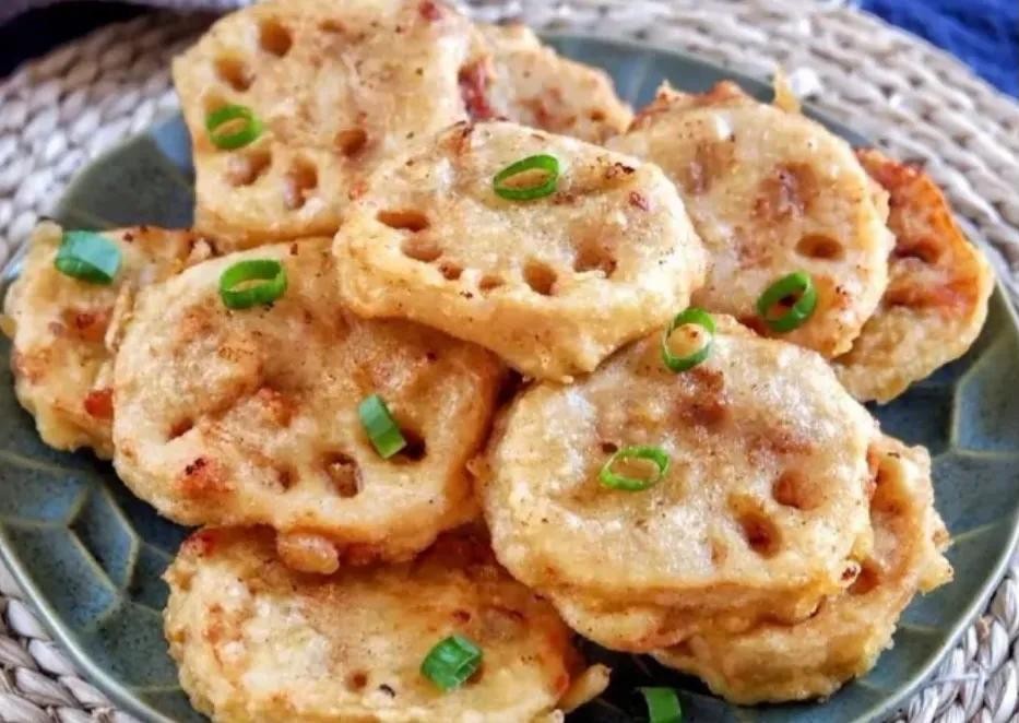 (5)锅中热油放入藕盒,中小火慢炸至金黄色捞出控干油分,撒上葱花点缀即可盛盘开吃了,酥酥脆脆的外皮里面肉嫩鲜香全家都爱吃年夜饭必备!