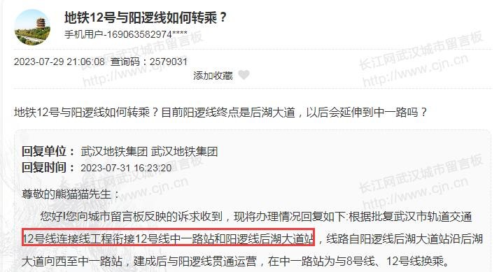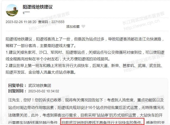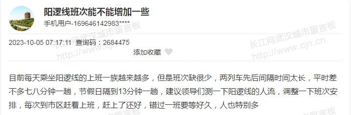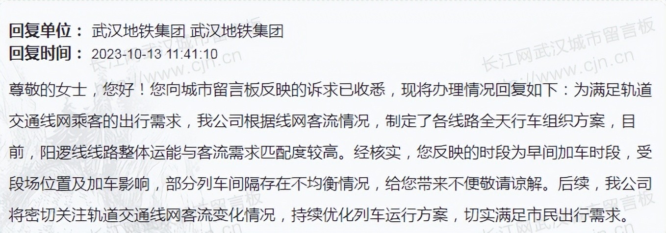 ①建议阳逻线增加班次,缩短等车时间。网友普遍反应阳逻线平时差不多7、8分钟一趟,节假日甚至达13分左右一趟,对此地铁集团回复目前阳逻线线路整体运能与客流匹配度较高,将密切关注轨道交通线网客流变化情况,持续优化列车运营方案。