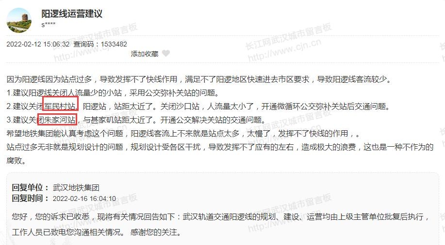 ②建议关闭部分站距太近的站点,或开行“大站快车”实现线路提速,如军民村站、朱家河站等。地铁集团回复无特殊情况无法随意关闭,目前不具备开行大站快车的条件。