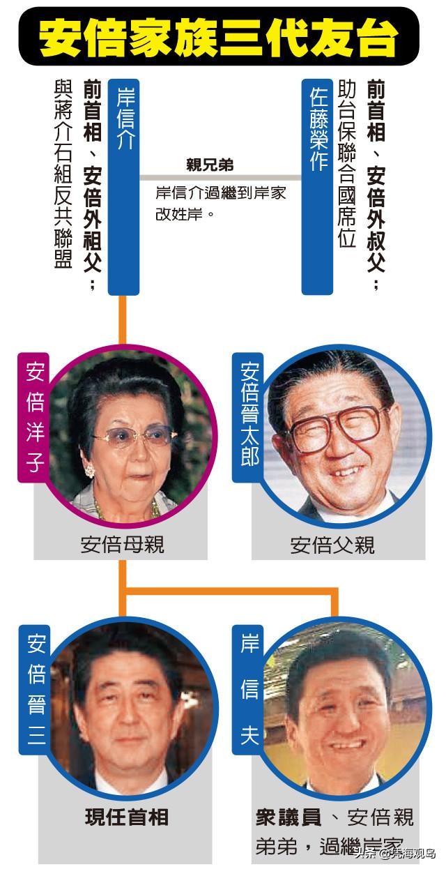 如果说蔡英文当时还只是在情感上对日本很亲近的话,比她大两岁的安倍就是血液里都流淌着“台湾帮”的DNA。安倍一家可以说是日本政坛最有影响力的亲台家族,咱们把他们一家三代挨个拉出来说说。