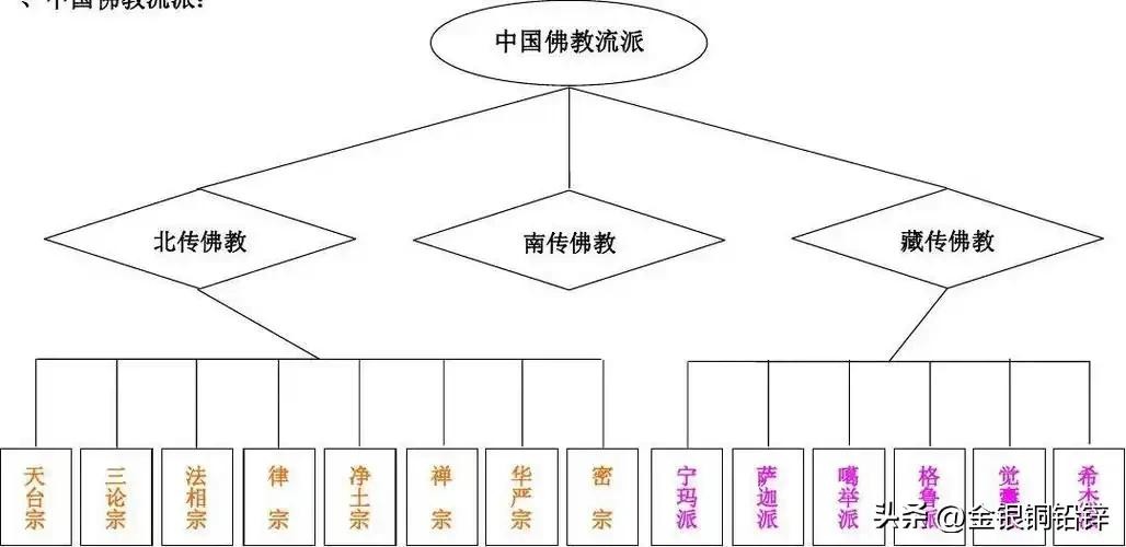 (四)佛教流派。为什么佛教会有那么多派别(分支)?据说释迦牟尼成佛前曾经拜了许多先师,试用了多种方法,学知悟道成佛,但都未实现目的,后来还是自己在一颗菩提树下苦思冥想,突然悟道成佛的。他成佛后,以前他曾经拜过的先师,加上其他愿意学习的人都拜到在他的名下,学习悟道成佛的方法、教义。释迦作为第一个成佛的人,自然会向他们传授相关知识。但他没有留下一个字,而是通过讲经说法,即口对口当面传授的形式进行讲解的。众信徒也主要以心记的方式去领悟。后来这些“学员”怕这些知识不能传承,于是就其将所听所记写了出来,因此出现了许多所谓的经典。其中,有些是释迦本人的想法,有些则是学徒自己的理解和扩大。由于各人所记所理解不同,于是出现了许多不同的版本,后来就是由这些不同的版本演化为不同的派别或分支。