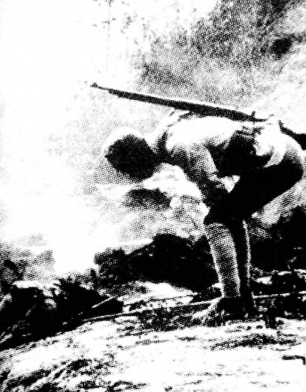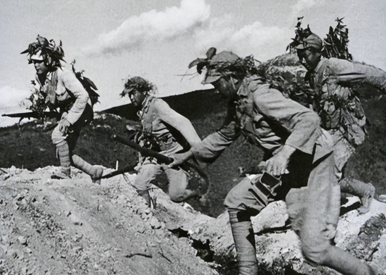 惨烈的战斗过后,一名中国士兵俯身察看阵地上阵亡的战友。