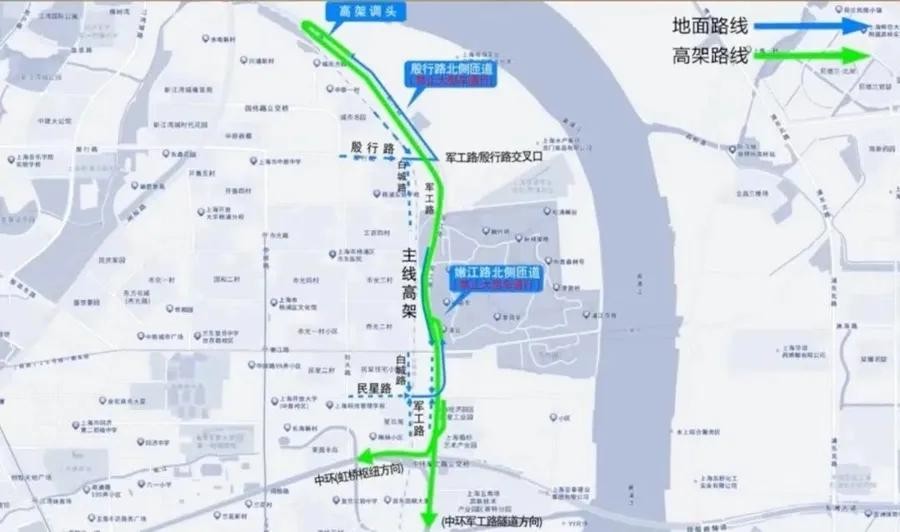 殷行路匝道、嫩江路北侧匝道未来规划为军工路高架南向北方向上匝道,施工期间在这两处匝道上高架后,需在高架上掉头向南驶向中环;