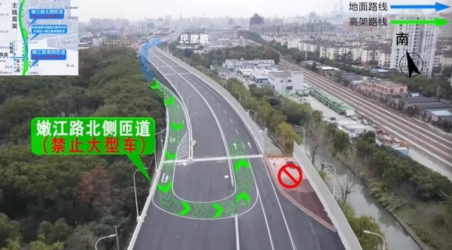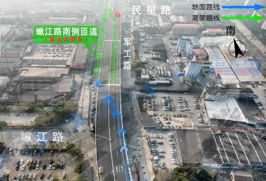原民星路自西向东而来的车辆,至军工路无法再右转上高架,而是要左转前行至嫩江路北侧匝道上高架掉头。