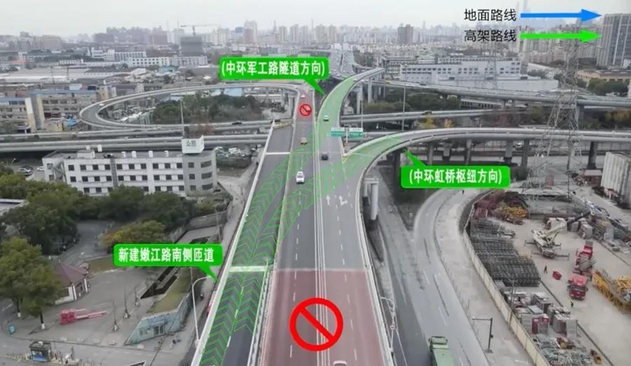 作为服务杨浦、宝山沿江地区的重要出行通道,中环高架民星路上下匝道封闭施工将给周边道路通行带来较大影响。施工期间,将临时开通部分新建军工路高架解决“上中环”问题,即设置军工路高架嫩江路南、北侧匝道、殷行路匝道为临时上匝道,同步开放军工路高架(殷行路至中环)主线道路,并通过局部新建桥梁实现与中环连通。