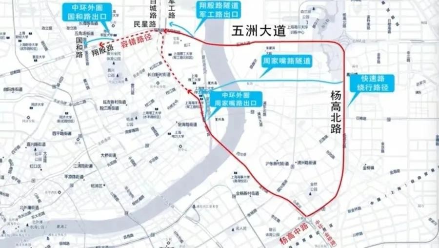 中环外圈可从中环周家嘴路、国和路出口匝道或翔殷路隧道、周家嘴路隧道等绕行;