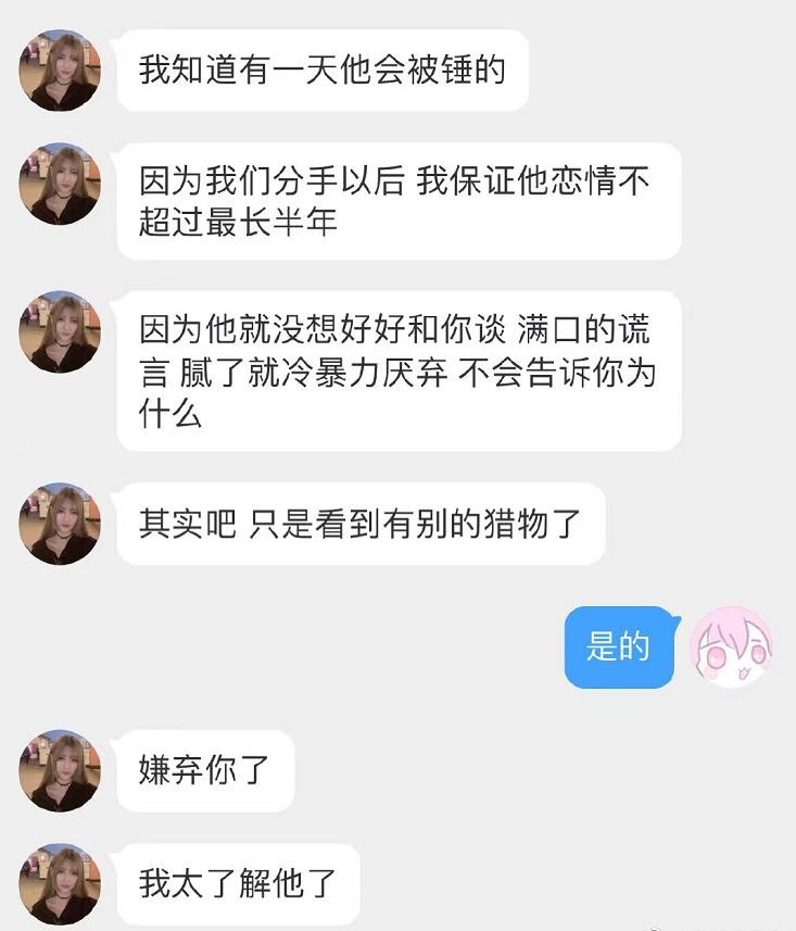 更离谱的是在安然休养期间,他还和其他女生勾勾搭搭,安然把他的网恋聊天记录看了个遍,但是当时还是阻止了朋友微博放大锤。现在选择站出来还是不想让更多的女生被小虎的外表蒙蔽了,其实他就是个不折不扣的大渣男!