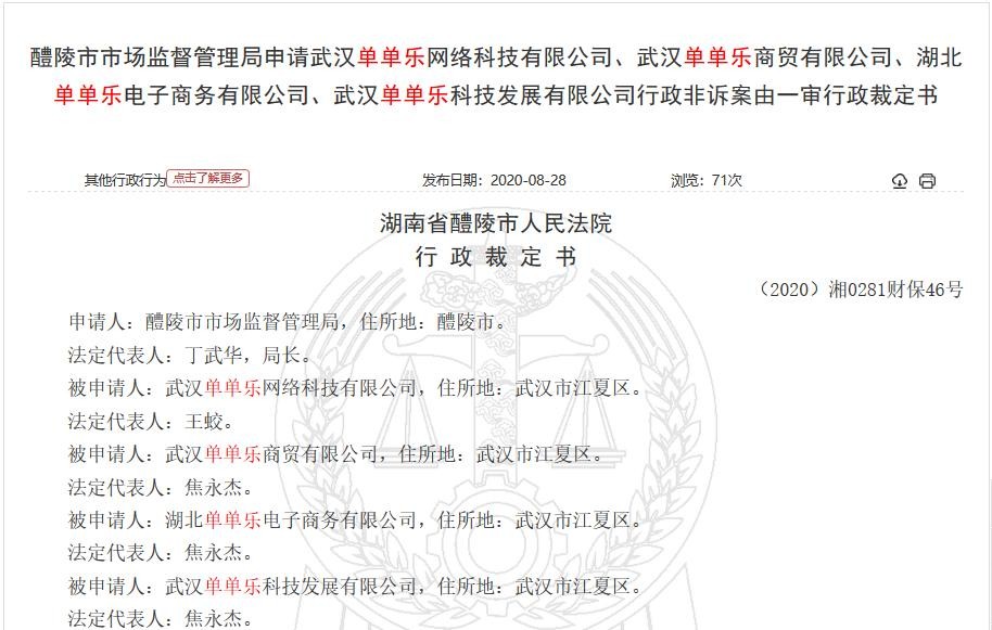 《行政裁定书》显示,醴陵市市场监督管理局在查处被申请人武汉单单乐网络科技有限公司、武汉单单乐商贸有限公司、湖北单单乐电子商务有限公司、武汉单单乐科技发展有限公司涉嫌传销案中,为防止上述4家公司转移或隐匿违法资金,向法院申请: