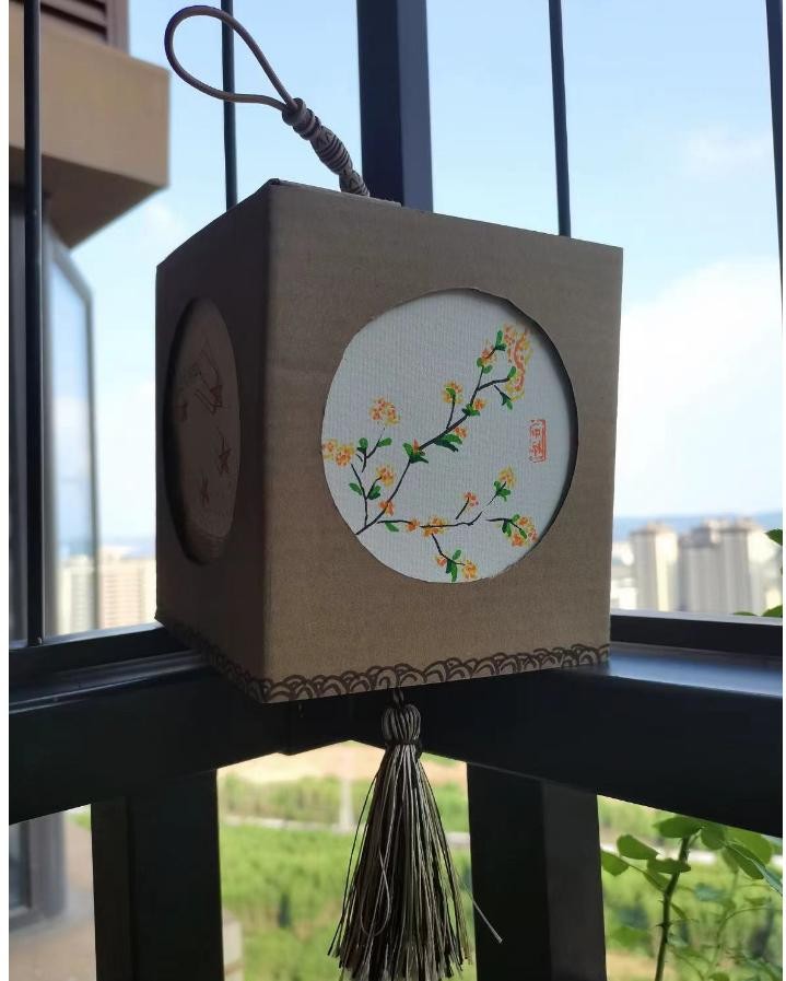 正方体盒子四面掏空成圆形,附粘上白纸,纸上画一些古风元素的画,虽然这盏提灯并不是特别精致,但足以令人眼前一亮。