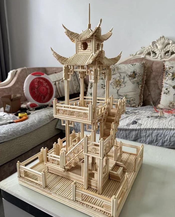 是的,你没看错,这是一位妈妈耗费了多双一次性筷子做成的木雕亭,其中堆砌雕花非常考验水平,整幅作品精致美观,简直称得上是一件工艺品了。