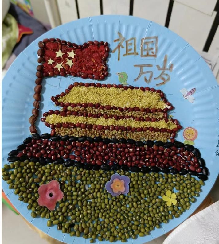 为了契合国庆主题,这位妈妈用红豆、绿豆、小米、荞麦等杂粮在圆盘上拼出了一幅“祖国万岁图”。