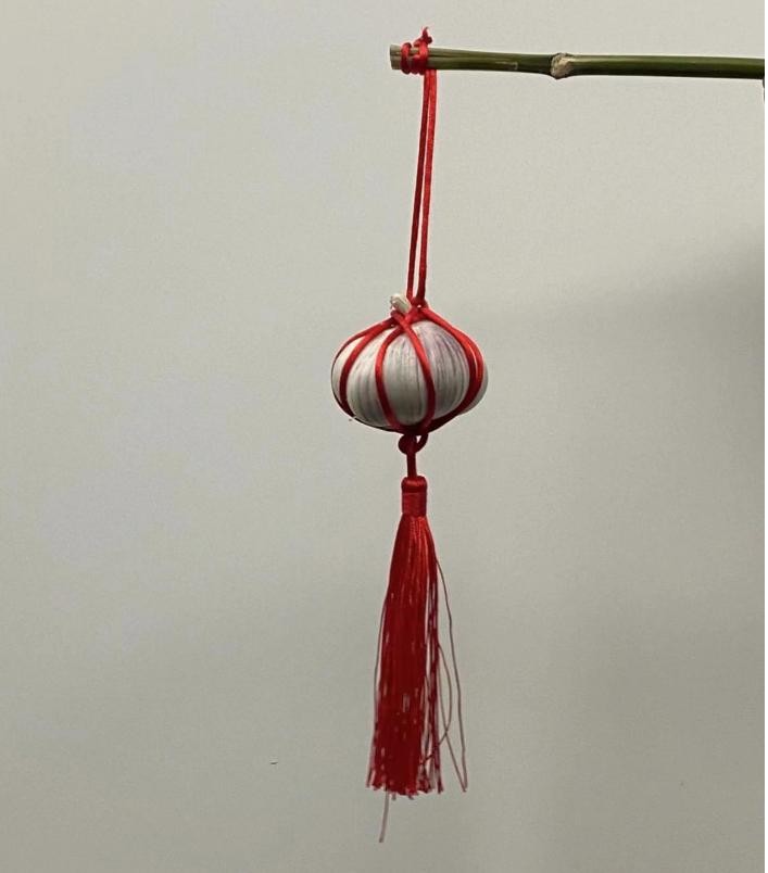 一根树枝,一个红色小网兜,一个蒜头,一个小灯笼就出炉了。