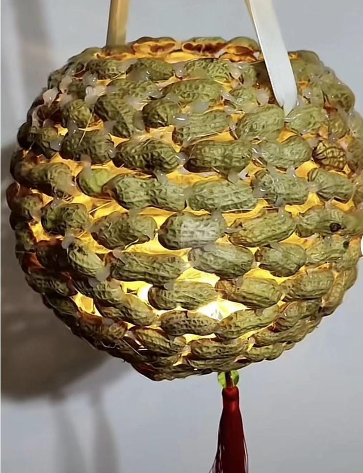 而为了让这个灯笼做得别致又新颖,宝妈脑洞大开,她决定废物利用,将自己吃剩下来的花生壳当成制作灯笼的主材料,并用烛胶将这些花生壳粘在一起。