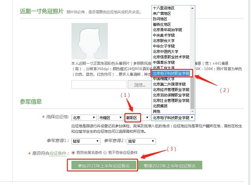 参军信息中“选择应征地”填写:北京-市辖区-朝阳区-北京电子科技职业学院。最后,点击“参加2021年上半年应征报名”。