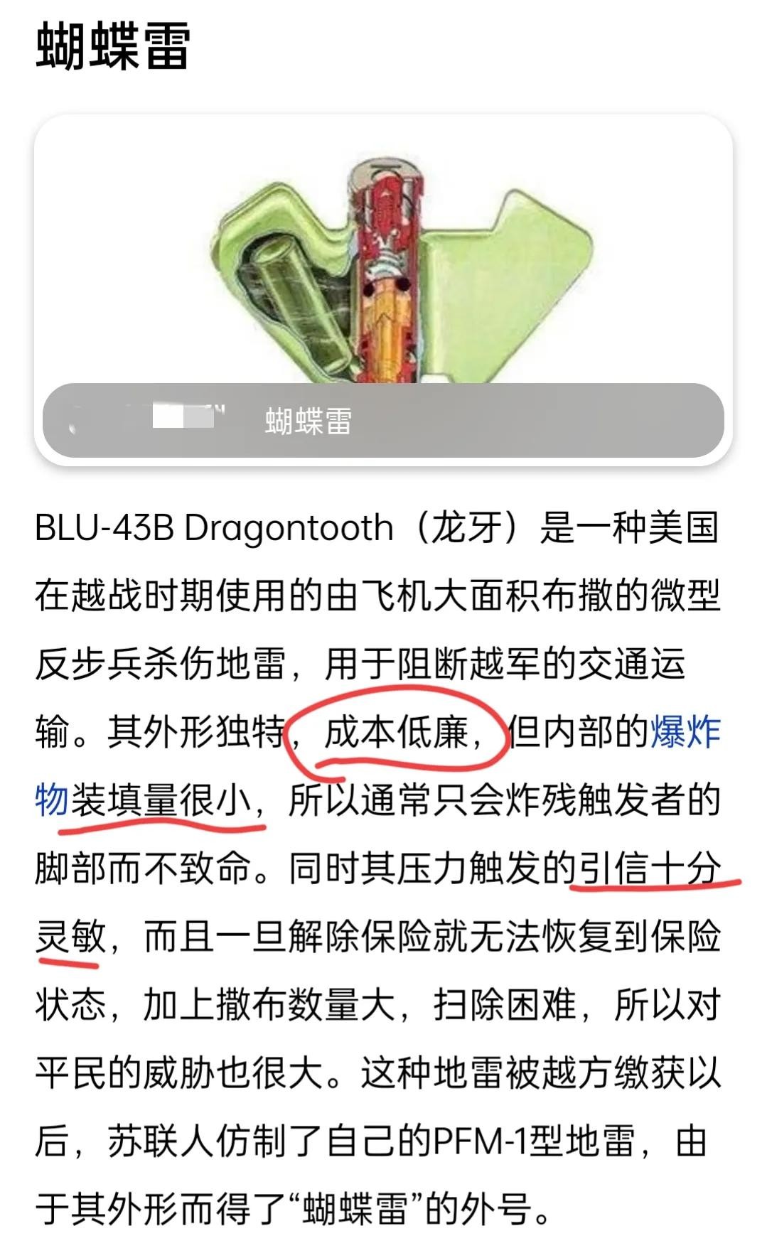 第一,因为蝴蝶雷成本极低,所以每次投放都是特别大量、密集,被军方称之为“美丽的死神”。