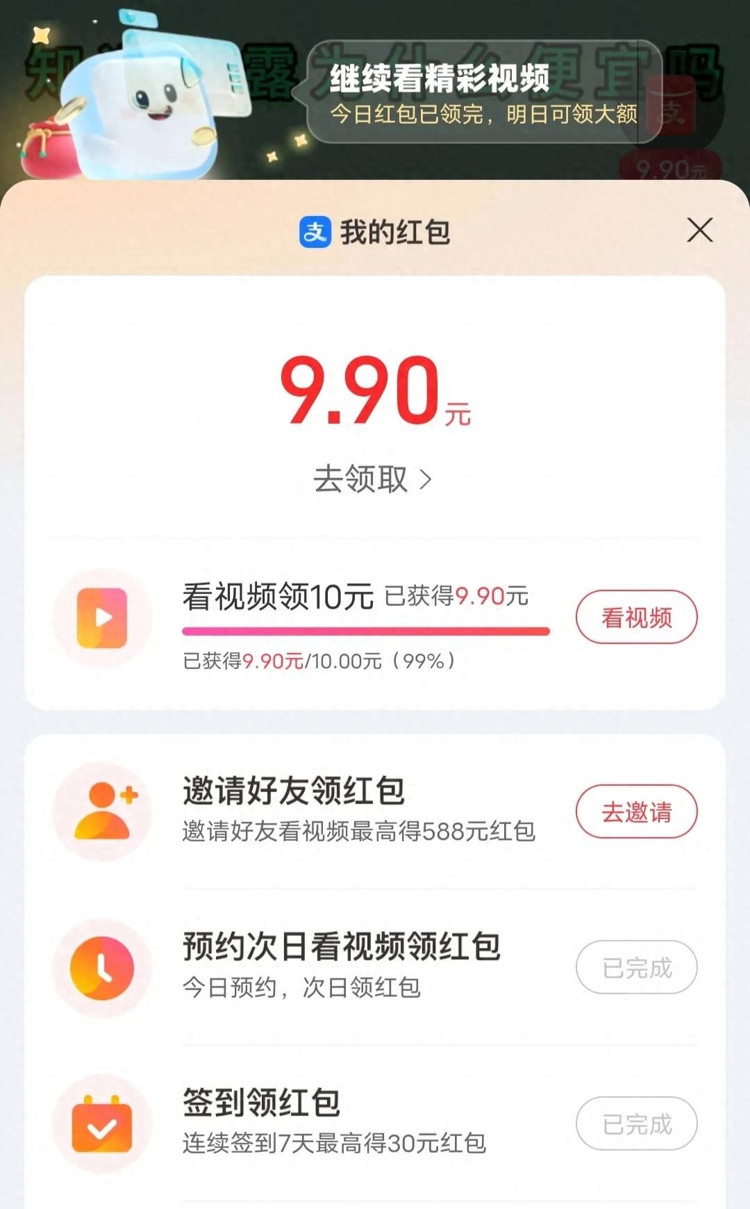 支付宝看视频领支付红包,最高可领588元,快来参与吧!