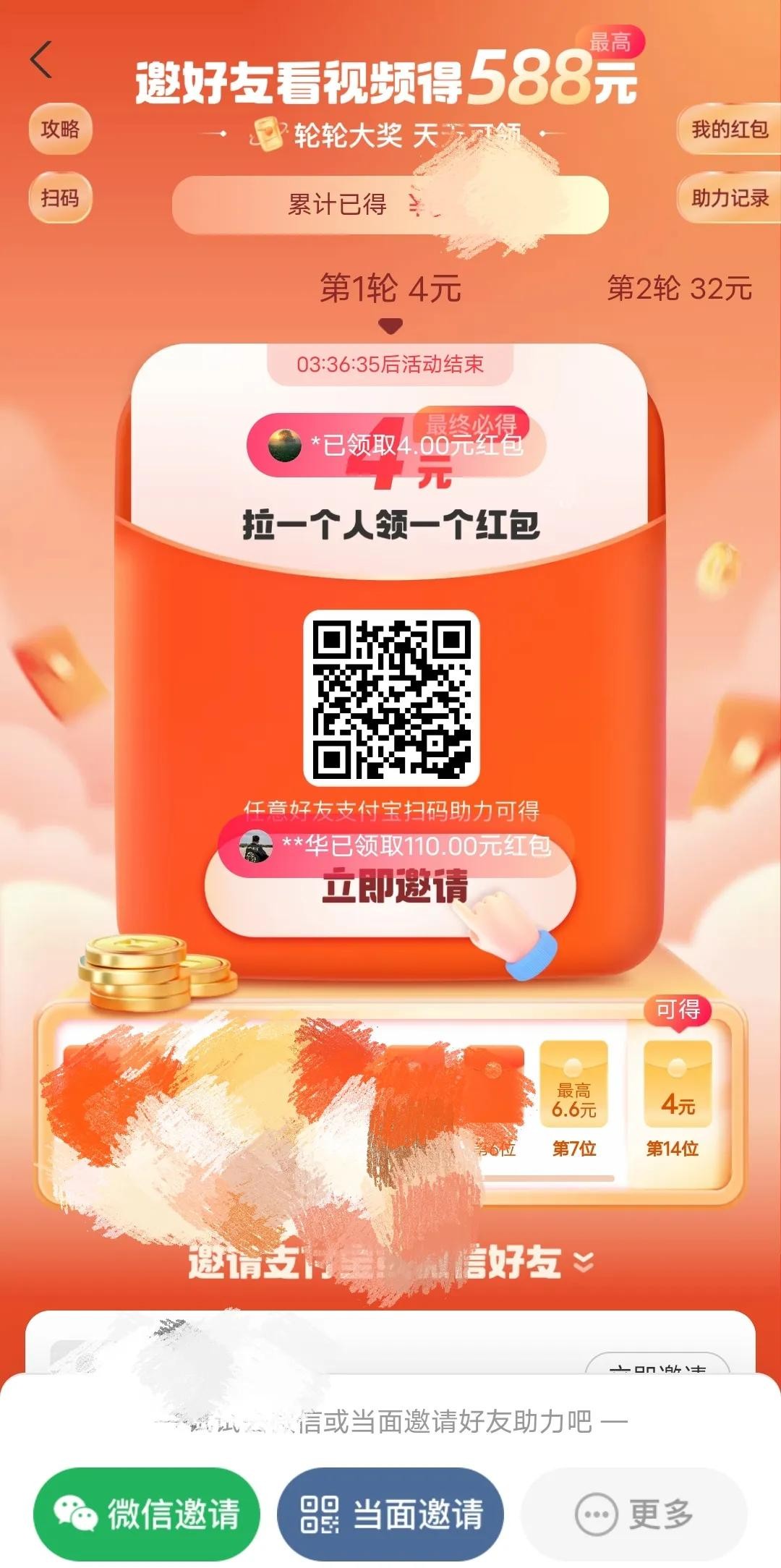 其次是邀请好友看视频领红包。用户可以通过分享链接或二维码的方式邀请好友加入支付宝视频板块,每成功邀请一位好友观看视频,邀请者即可获得一定的红包奖励,最高可达588元。这种裂变式的邀请机制,不仅让用户能够享受到更多的收益,也帮助支付宝视频板块迅速扩大了用户规模。