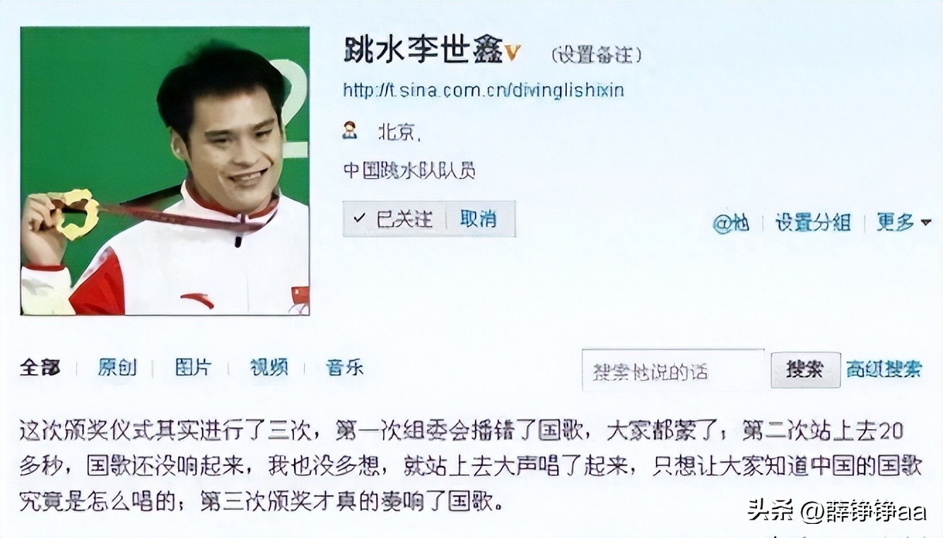 在2011年国际泳联举办的跳水大奖赛上,李世鑫跟自己的队友张新华一道,包揽了男子跳板的冠亚军,可在颁奖典礼上,主办方竟然放错了中国国歌,这让当时场上的一众国人都始料未及。
