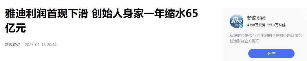 新浪财经 2025-01-15——《雅迪利润首现下滑 创始人身家一年缩水65亿元》
