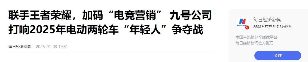 信息来源:每日经济新闻 2025-01-03——《联手王者荣耀,加码“电竞营销” 九号公司打响2025年电动两轮车“年轻人”争夺战》
