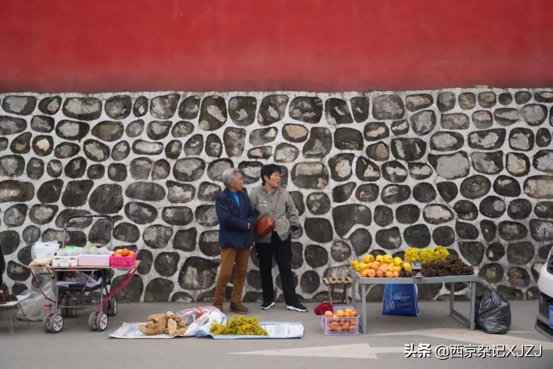 要在村里走上三四百米,才能到寺跟前,只有一条路也不会迷路。这一截路边,有很多村民摆着新采的蔬菜售卖,水萝卜和南瓜一堆堆,十分水灵。大小不一的猕猴桃个个紧致,不像是大果园的。