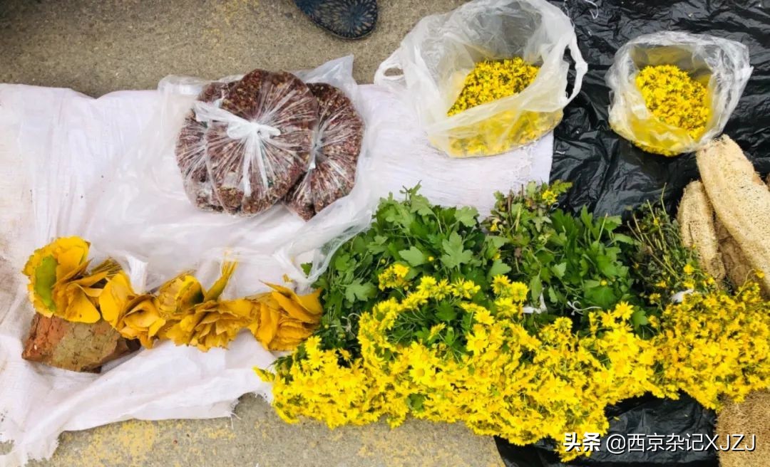 一小把一小把挤在一起的植物还以为是香椿,只是顶上带着小指甲大小的花朵锦簇。老妪介绍说是秦岭北坡的野菊花,可以泡水喝,纯野生的劲儿大。拿起一把看看,山间雏菊的幽香十分浓厚。