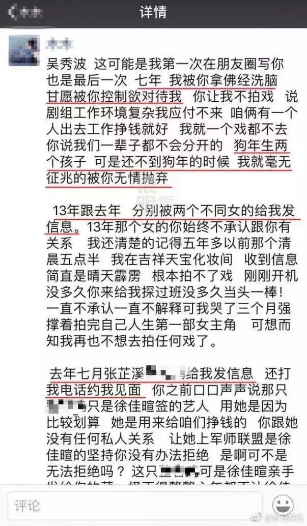 吴秀波有老婆有孩子也是娱乐圈都知道的事情,正宫都没出来发话。所以这场指责是一个“小三”声泪俱下撕“小四小五”的故事咯?