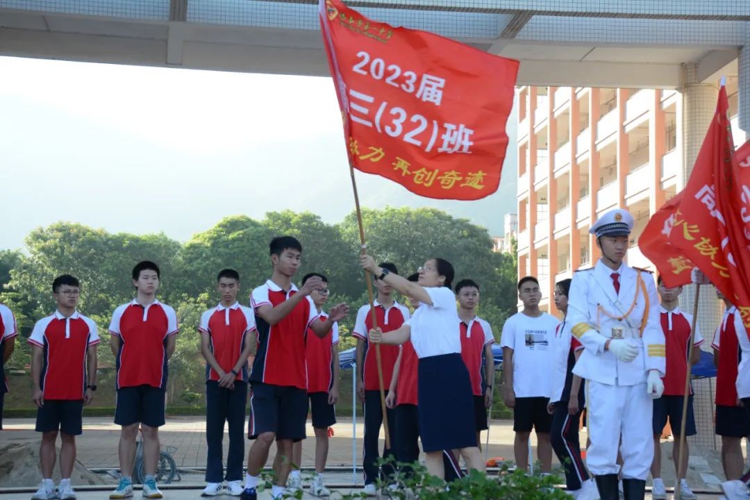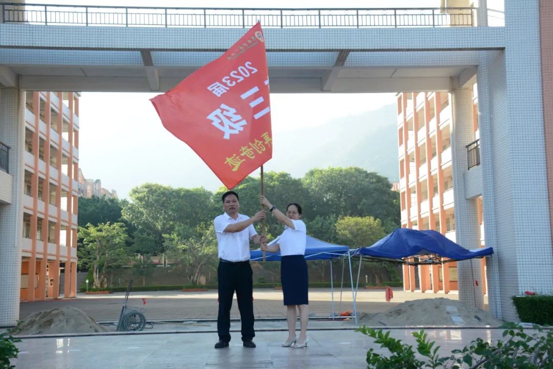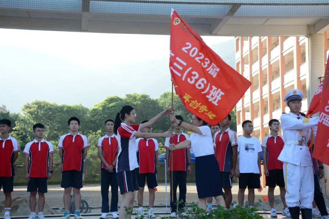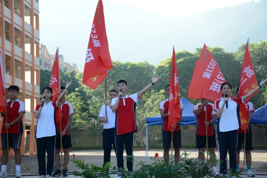 接着,黄显连为各班学生代表授予班旗。随后,高三年级学生代表苏昭泓号召全体学子举起右手,发出青春的誓言,“以无悔青春,赢高考辉煌!”的宣誓声,响彻天际。