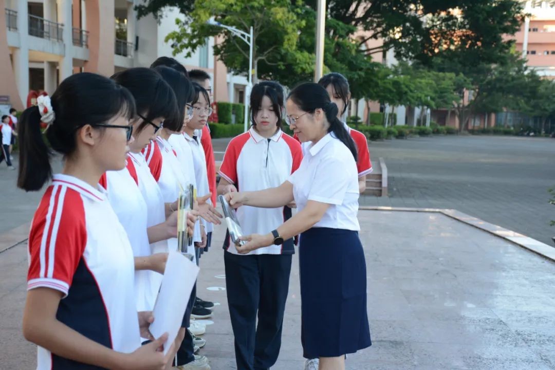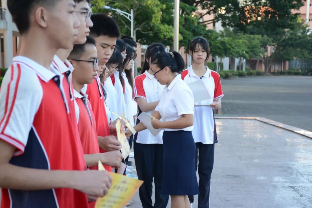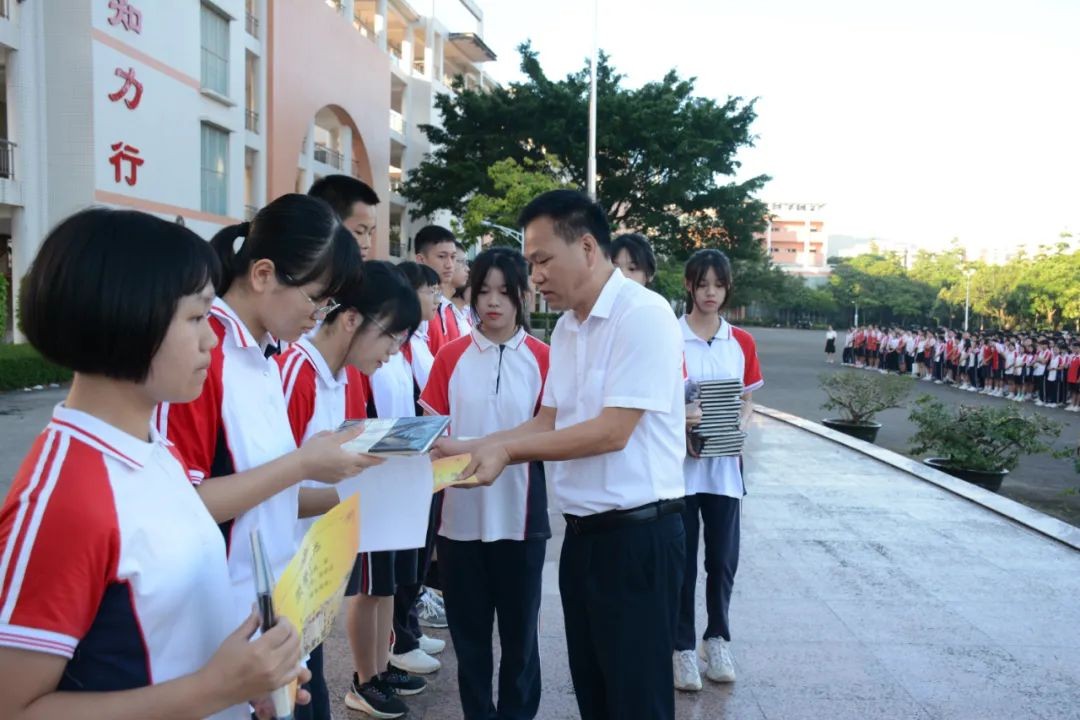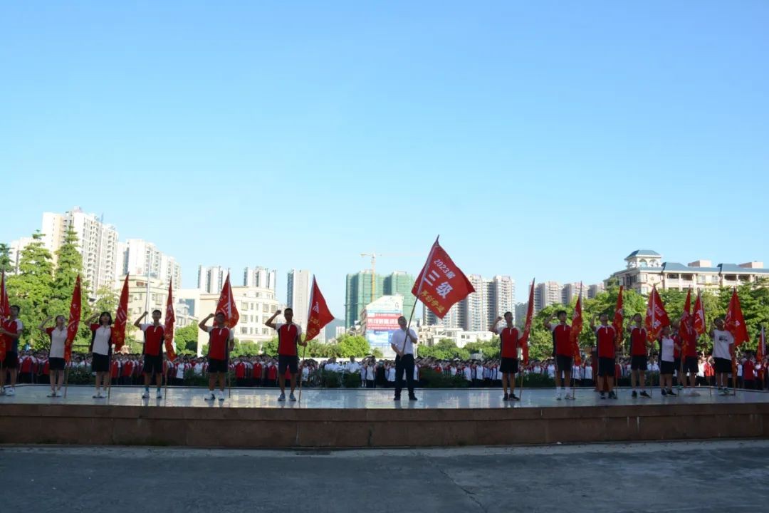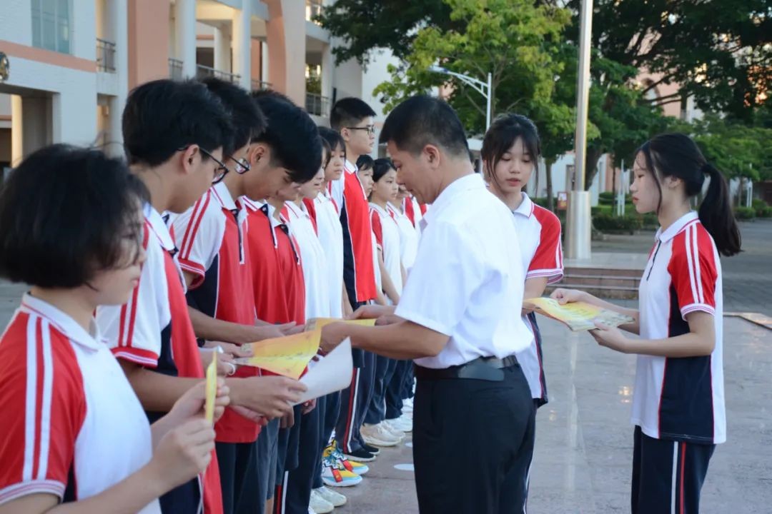 接着,黄显连为各班学生代表授予班旗。随后,高三年级学生代表苏昭泓号召全体学子举起右手,发出青春的誓言,“以无悔青春,赢高考辉煌!”的宣誓声,响彻天际。