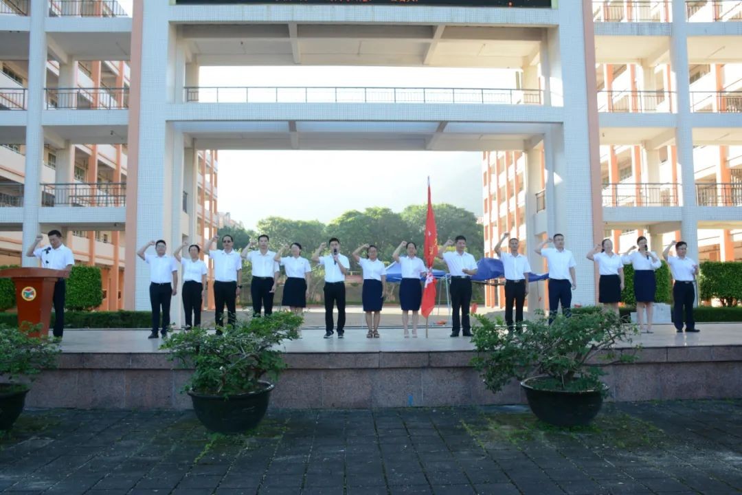 红旗飘,战鼓擂,誓言出。在2023届师生的共同瞩目下,谭元军向黄显连授予2023届高三级战旗。随后,陈育学带领高三全体校务委员庄严宣誓。