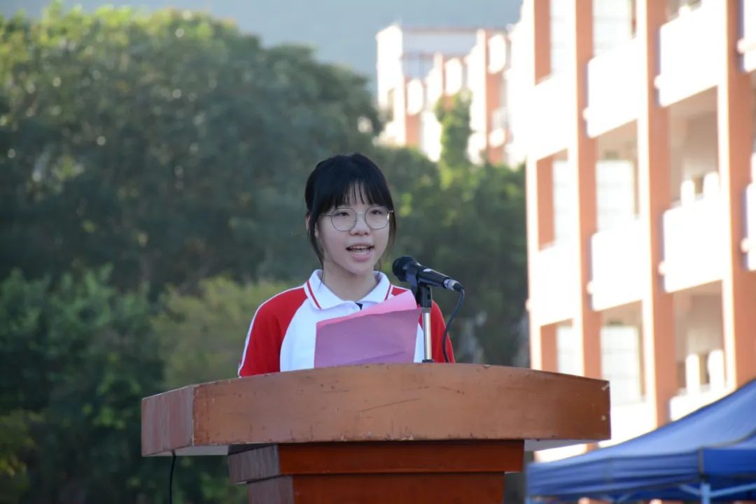 典礼的第三项议程,由学生代表高三(1)班岑宝儿作主题为“向前,改变,就现在”的国旗下讲话。她给高三的学子们分享了学习的感悟,号召大家从现在开始改变学习态度,一起向高三前进,一起向未来逐梦。