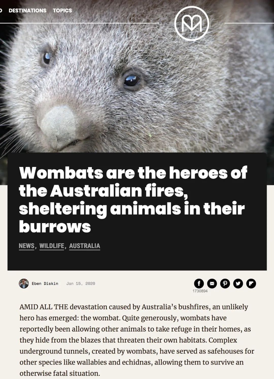 袋熊善于挖洞,洞深往往可达20-30米,藏身幽深地下能帮助它们躲过一劫。而在这场火浪滔天的灾难中,袋熊成为不折不扣的天使。作为世界上最会打洞的动物之一,它们慷慨允许别的动物到自己家里避难,允许其他物种“威胁”自己的领地,其中包括蜥蜴、兔子、考拉甚至袋鼠。