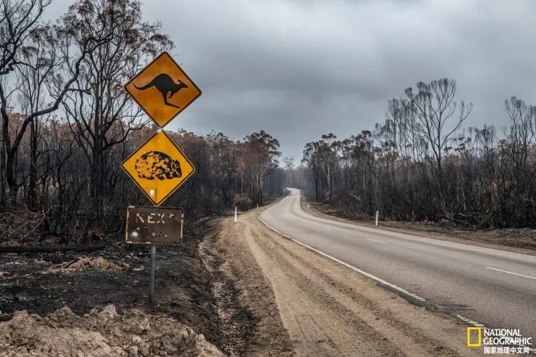 2019年底,维多利亚州某森林被烧毁,标示袋鼠和袋熊出没的路牌伫立于废墟中,然而森林中早已一无所有。