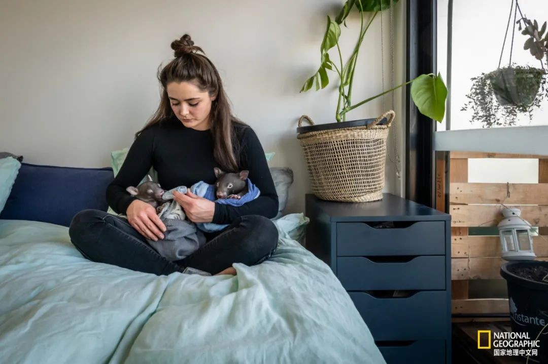 Emily Small在卧室里用奶瓶给两只袋熊喂奶。幼崽需要特殊配方奶粉,然而新冠疫情导致奶粉在当地较难买到。