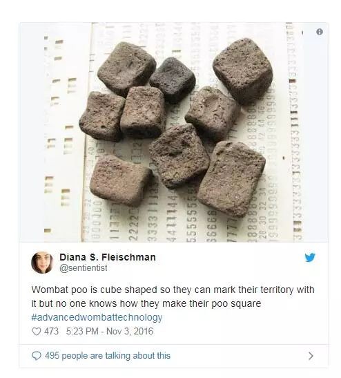 分布于澳大利亚东南部的塔斯马尼亚袋熊,其粪便是立方体形状的,它们可以用来标记领土,但粪便如何变成立方体无人知晓。