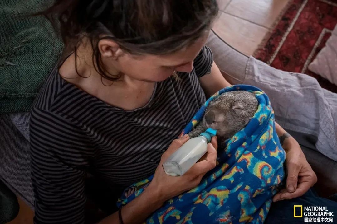 2020年1月,野生动物护理员用奶瓶给雄性塔斯马尼亚袋熊喂奶。几周前,大火摧毁澳大利亚维多利亚州野生动物保护所,这只袋熊与其他动物一起被救。