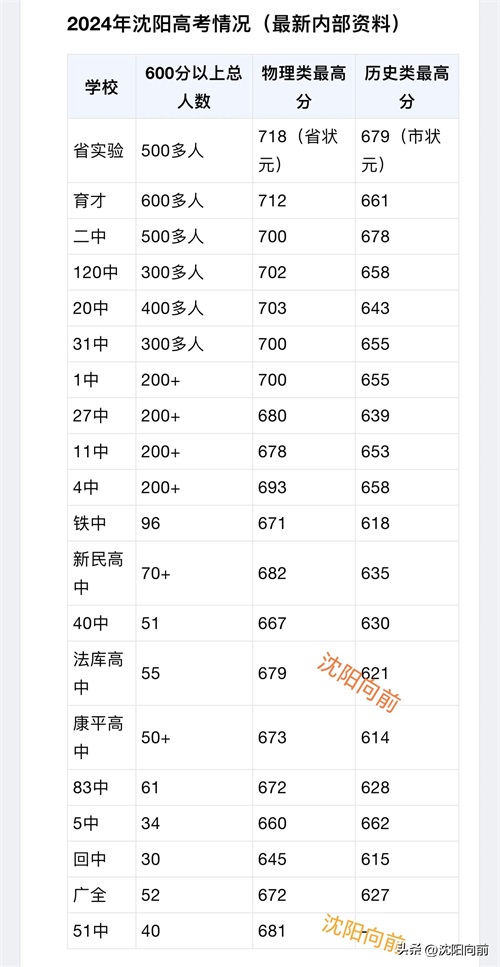 根据提供的2024年沈阳各高中的高考成绩数据,我将其归纳总结为以下五个大点: